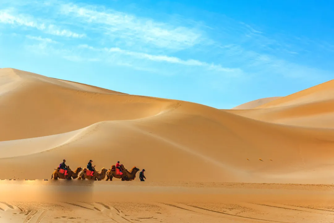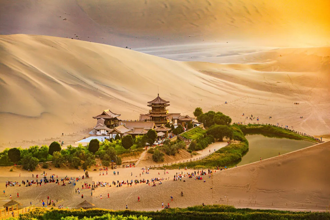 Today we will visit to the Echoing-Sand Mountain. Echoing-Sand Mountain is named after the sound of sand movement, there is Crescent Lake so called because of its shape. The water in the lake is so pure and sweet that it looks like an emerald set in the sand. Many of the visitors who have made their way down Echoing-Sand Mountain like to drink from the lake. According to historical record, the lake has been in existence for hundreds of years without ever being buried by the sand; it is really a geological wonder.